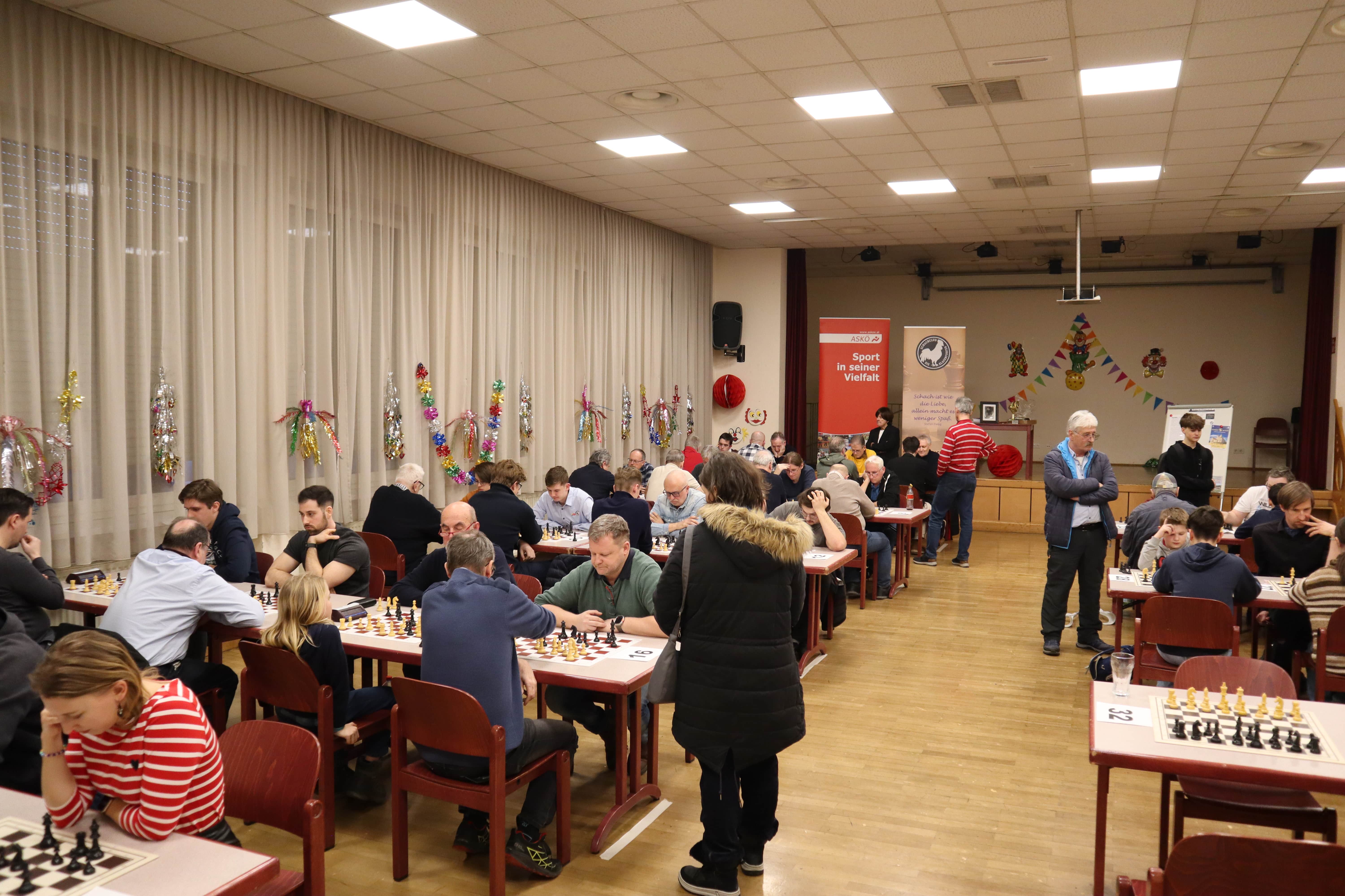 Das mittlerweile traditionelle Erich-Schwarz-Gedenkturnier lockte am 15.Februar 58 Schachbegeisterte an die Bretter. Mitten in den Faschingstagen stand der Spaß am Spiel und die Freude am Begegnungsraum Schach im Vordergrund. Nicht minder ernsthaft wurde jedoch am Brett Zug um Zug um jeden Punkt gefochten.